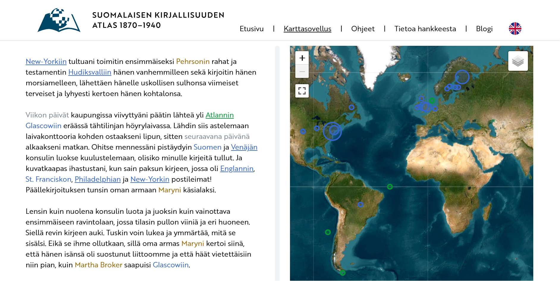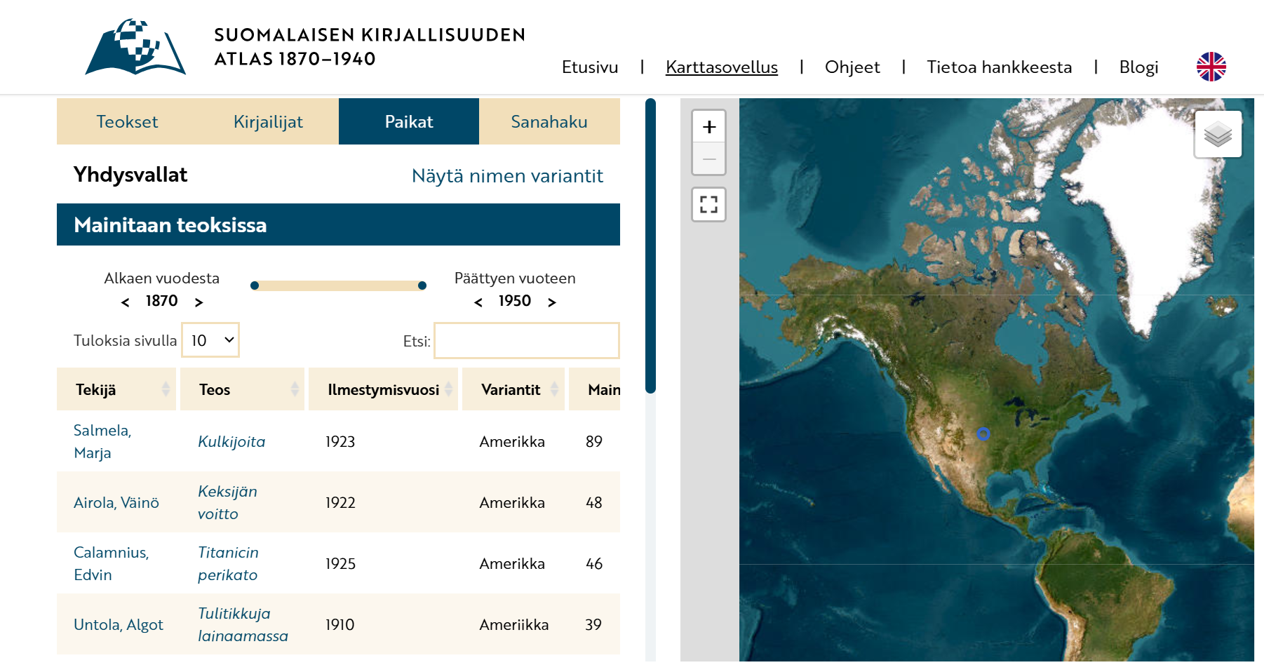 Olen tutkinut Suomalaisen kirjallisuuden atlas 1870–1940 -verkkosovelluksen avulla suomenkielisen kirjallisuuden paikannimistöä, ja todennut, että Pohjois-Amerikkaan suuntautunut siirtolaisuus näkyy suomenkielisessä kirjallisuudessa runsaina Amerikka-mainintoina. Tässä blogikirjoituksessa vertaan Atlas-sovelluksen kaunokirjallisen aineiston sisältämää Pohjois-Amerikkaan sijoittuvaa paikannimistöä Siirtolaisuusinstituutin ylläpitämän siirtolaiskirjeiden digiarkiston paikannimistöön. Siirtolaisuusinstituutti on muuttoliikkeiden tutkimukseen ja dokumentoimiseen erikoistunut laitos Suomessa.