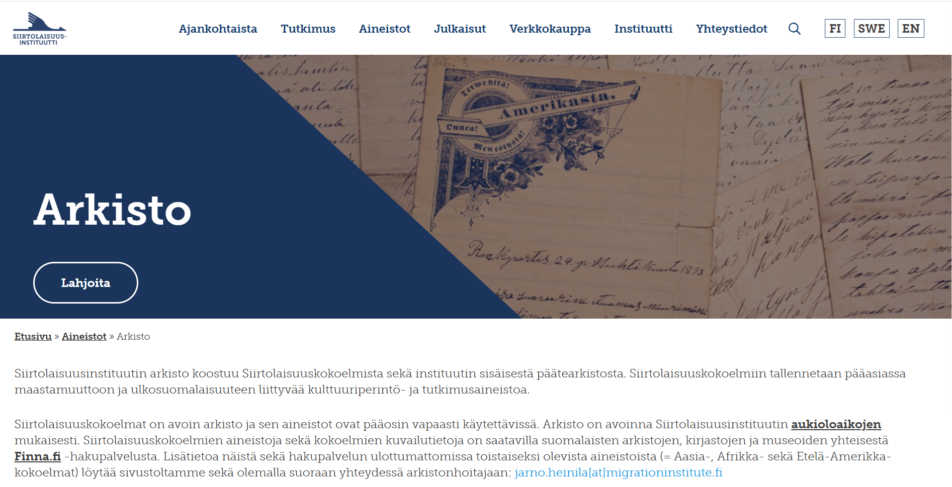 Siirtolaisuusinstituutin arkisto: https://siirtolaisuusinstituutti.fi/aineistot/arkisto/