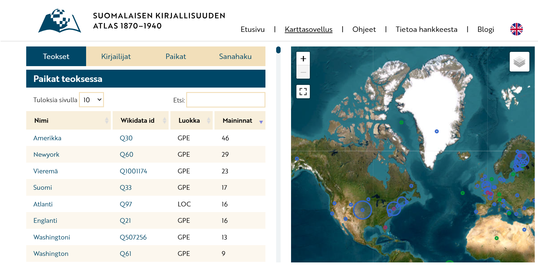 Olen tutkinut Suomalaisen kirjallisuuden atlas 1870–1940 -verkkosovelluksen avulla suomenkielisen kirjallisuuden paikannimistöä, ja todennut, että Pohjois-Amerikkaan suuntautunut siirtolaisuus näkyy suomenkielisessä kirjallisuudessa runsaina Amerikka-mainintoina. Tässä blogikirjoituksessa vertaan Atlas-sovelluksen kaunokirjallisen aineiston sisältämää Pohjois-Amerikkaan sijoittuvaa paikannimistöä Siirtolaisuusinstituutin ylläpitämän siirtolaiskirjeiden digiarkiston paikannimistöön. Siirtolaisuusinstituutti on muuttoliikkeiden tutkimukseen ja dokumentoimiseen erikoistunut laitos Suomessa.