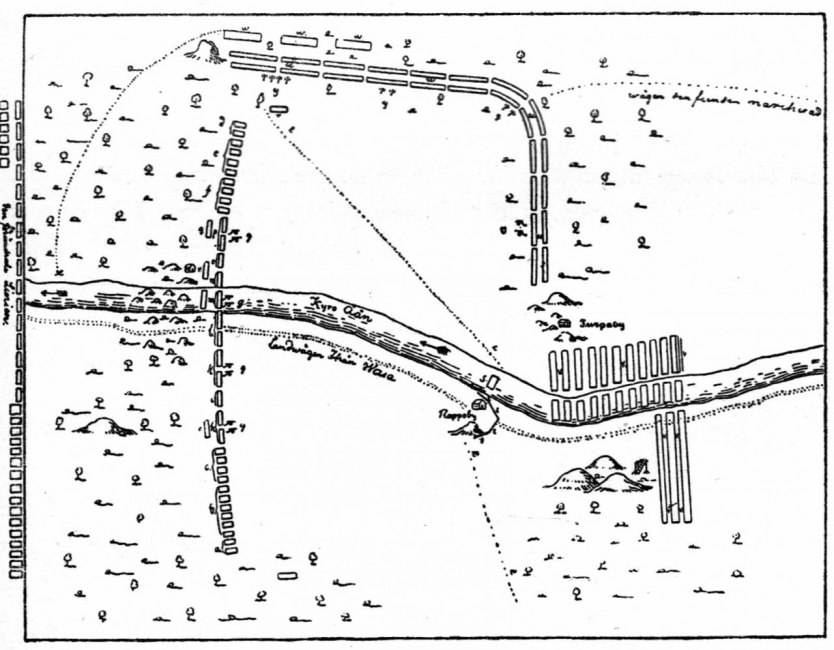 Napuen taistelu käytiin Isokyrössä 1714. Se oli suuren Pohjan sodan viimeinen taistelu Suomessa. Armfeltin piirros taistelun kulusta. Kuva: Public Domain.