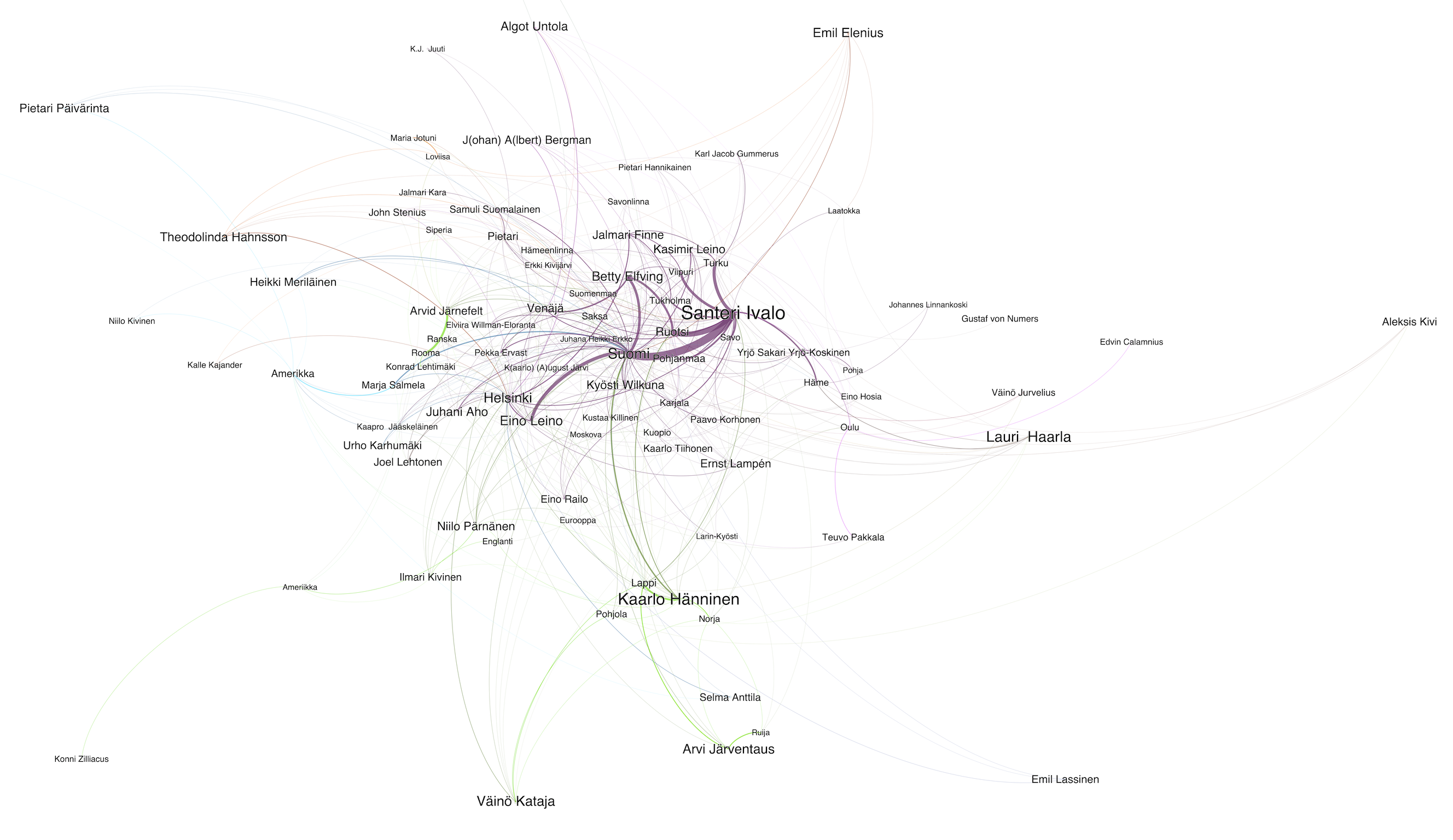 Alustavan analyysin jälkeen näyttää siis siltä, että historiallisia romaaneja kirjoittanut Santeri Ivalo oli hyvin tilallinen kirjailija, jonka tuotannossa on poikkeuksellisen paljon todellisia paikannimiä. Sama piirre näkyy verkostossa myös mm. Betty Elfvingin tuotannossa. Nämä hankkeemme tulokset ovat kuitenkin vielä alustavia ja tarkentuvat myöhemmin, kun saamme lisää dataa.