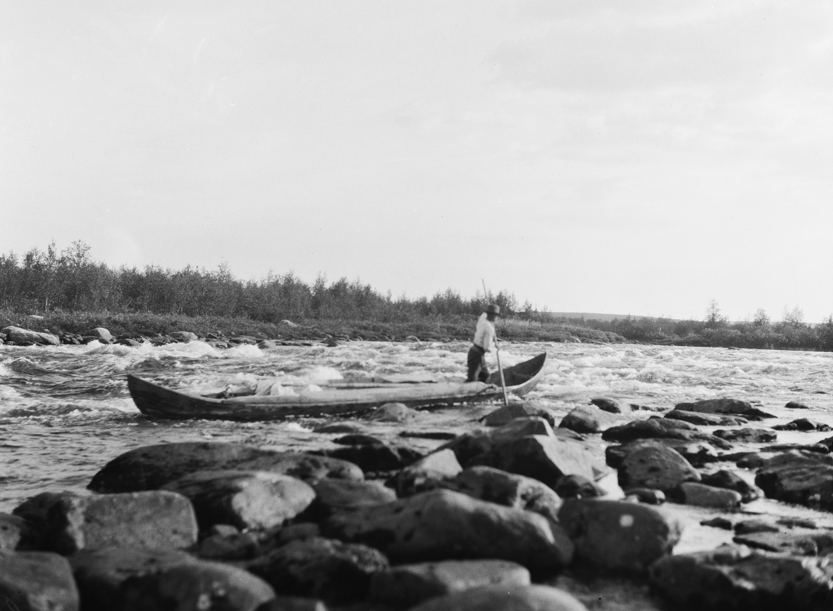 Koskiveneen sauvoja vei matkailijoita Kilpisjärveltä Palojoensuuhun. Kuva: Samuli Paulaharju, heinäkuu 1930/Museovirasto, kansatieteen kuvakokoelma, CC BY 4.0