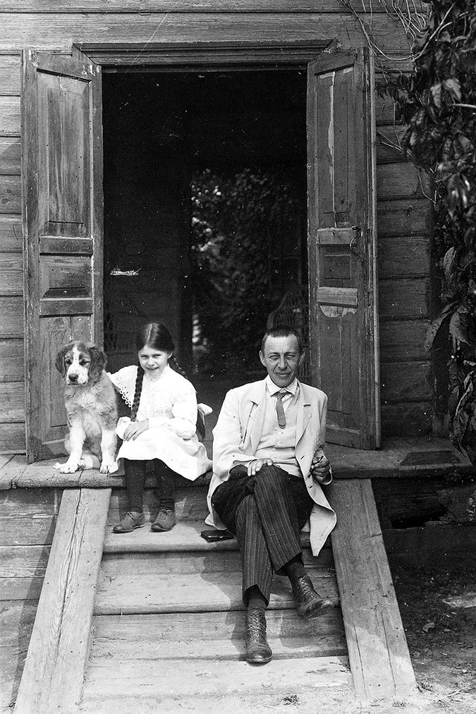 Rahmaninov Irina-tyttären kanssa Ivanovkan kesähuvilan edustalla vuonna 1913. Kuva: Wikimedia.