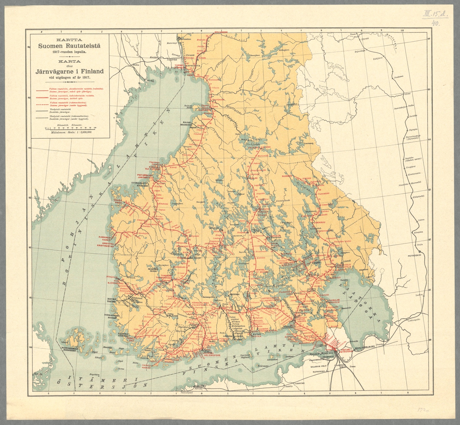 Suomen rautatieverkko vuoden 1917 lopulla. Kuva: Wikimedia.