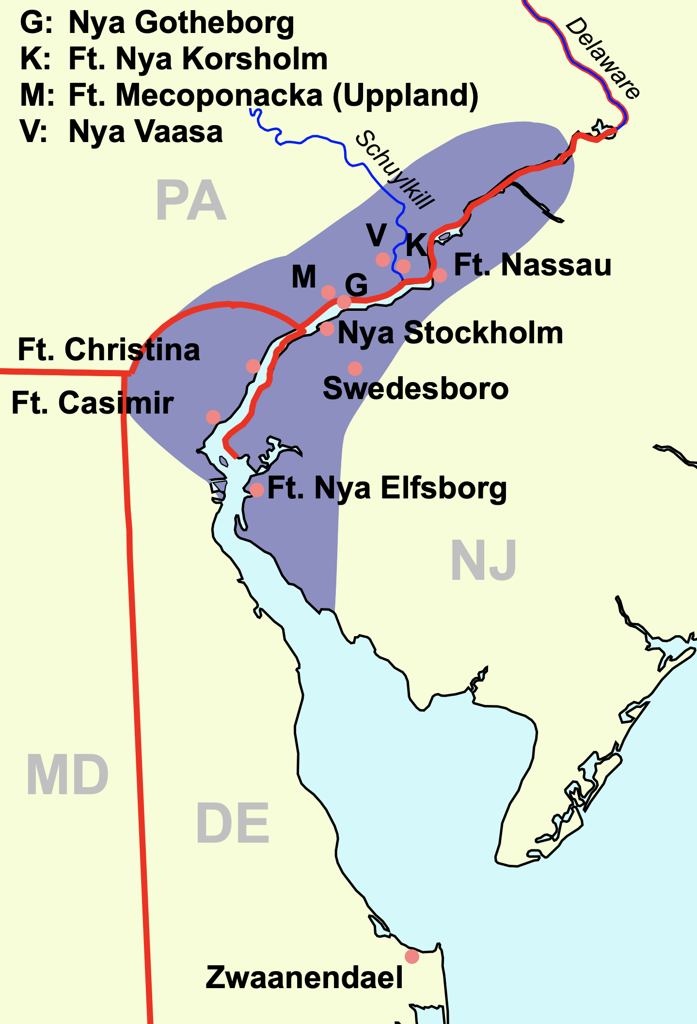 Uuden Ruotsin kartta. Lähde: https://commons.wikimedia.org/wiki/File:Nya_Sverige.svg. CC BY-SA 3.0