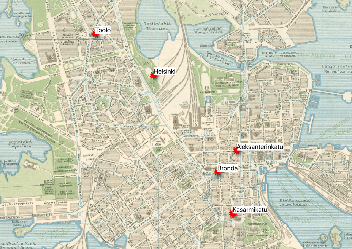 Toisaalta juhlinta ja nautintoaineet kuuluvat selvästi Kaartinkaupungin alueelle, ja sinne kuuluvat myös nopeat, modernit autot. Töölössä puolestaan asutaan, vaikkakin kaupunginosan modernia ulkonäköä muistetaan korostaa. Matka kulkee vielä takaisin Rämeen asuntoon, jonka sijaintia ei ole mainittu ja taas Astrin luo, ja sieltä alkaakin automatka kohti Neuvostoliittoa.